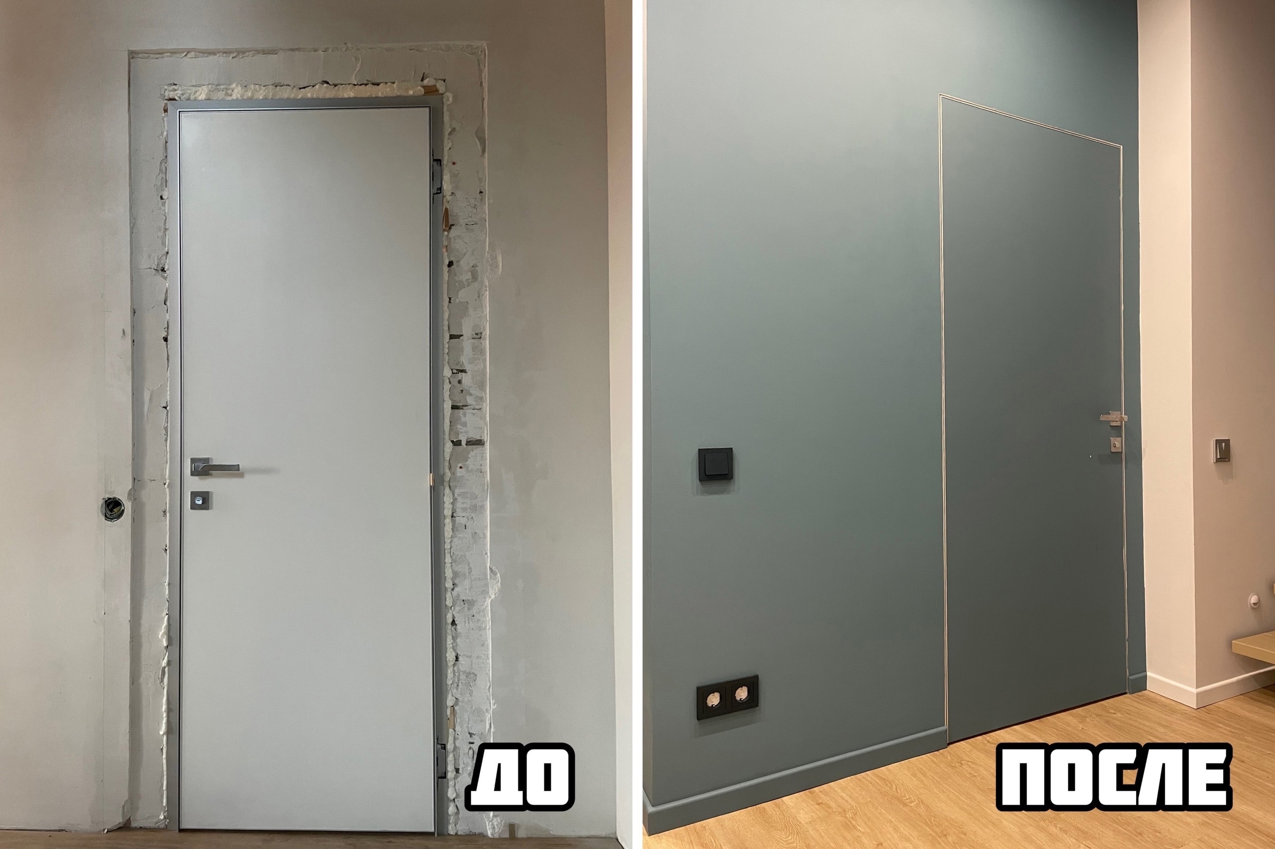 На фото - скрытая дверь до и после монтажа. Далее вокруг нее штукатурится, шпатлюется и красится. В идеале - штукатурить вокруг двери с использованием серпянки.