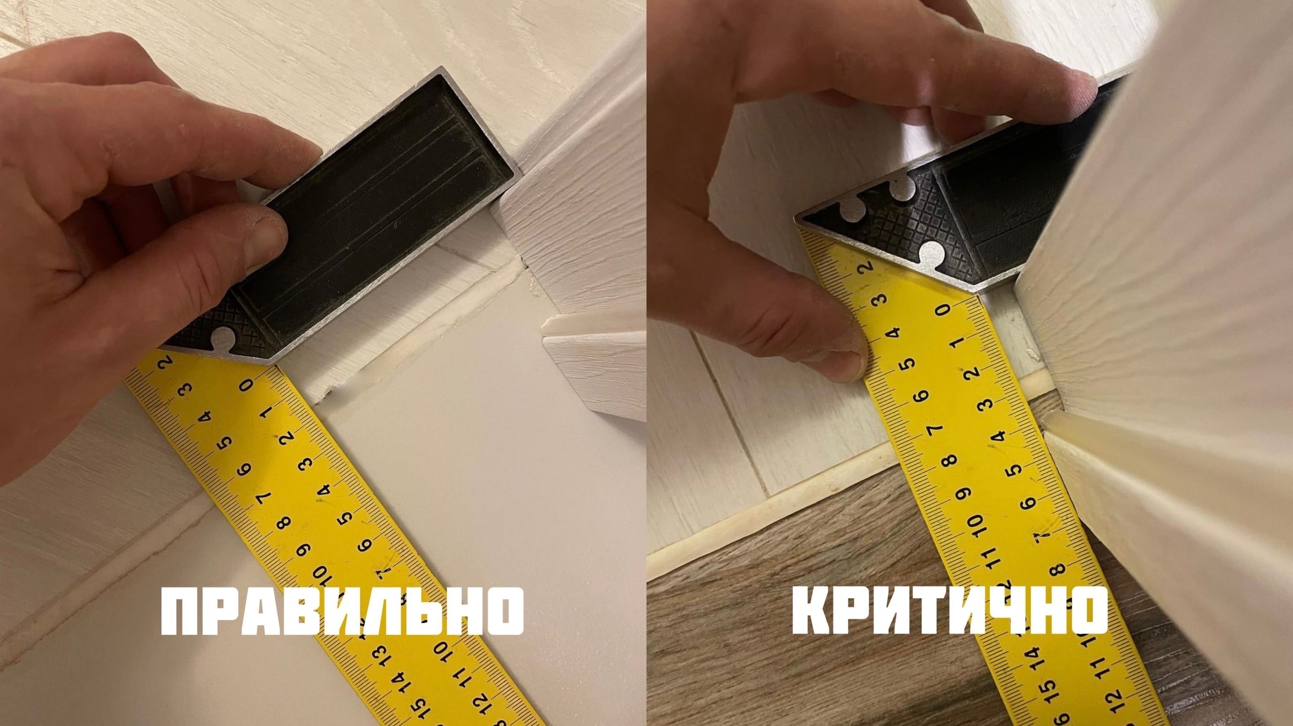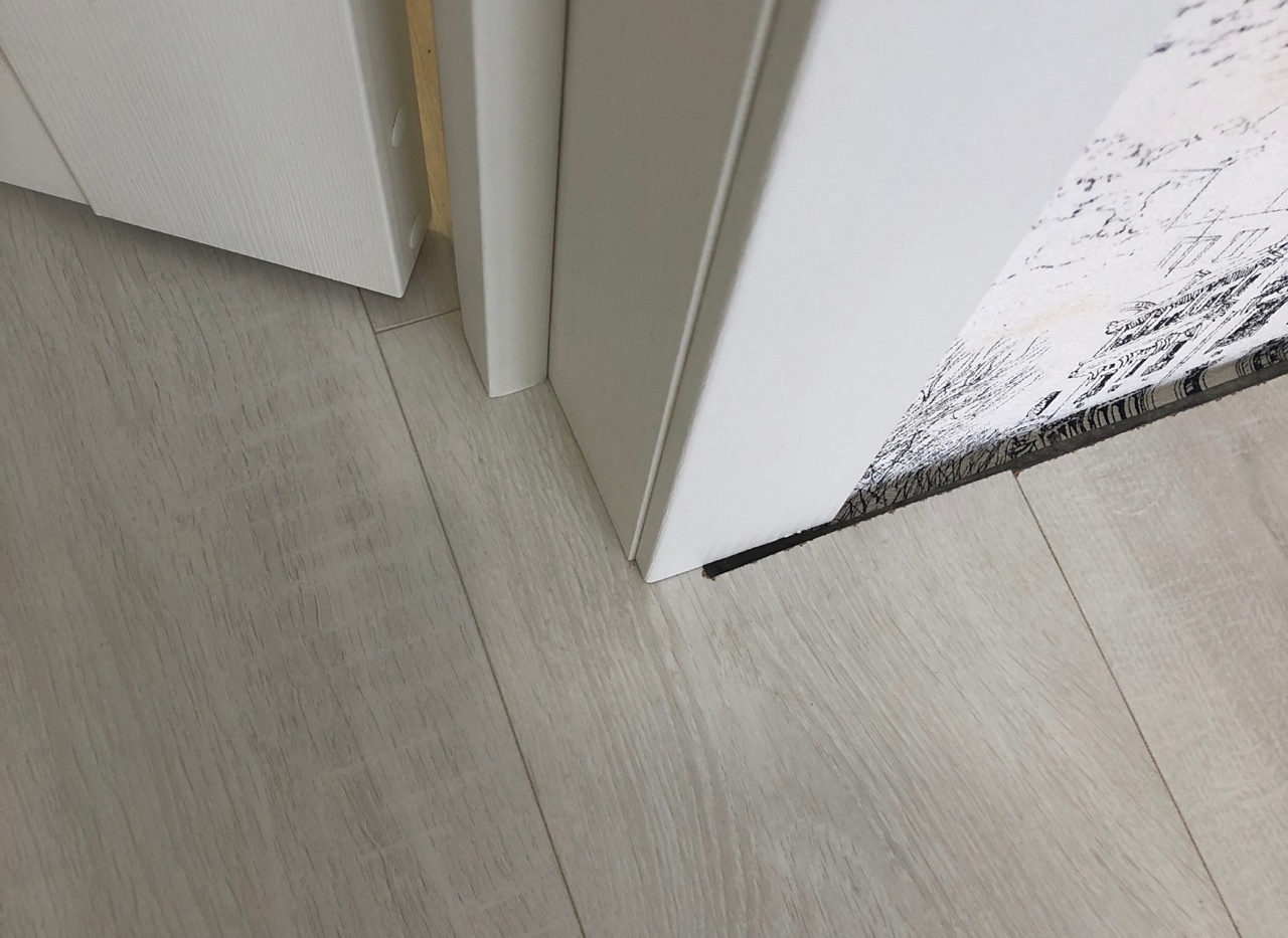 Отступ ламината/кафеля/кварцвинила от стены вблизи проёма не должен превышать 5мм, иначе наличник может не закрыть образовавшуюся щель, так как толщина стандартного наличника - 8-10мм.